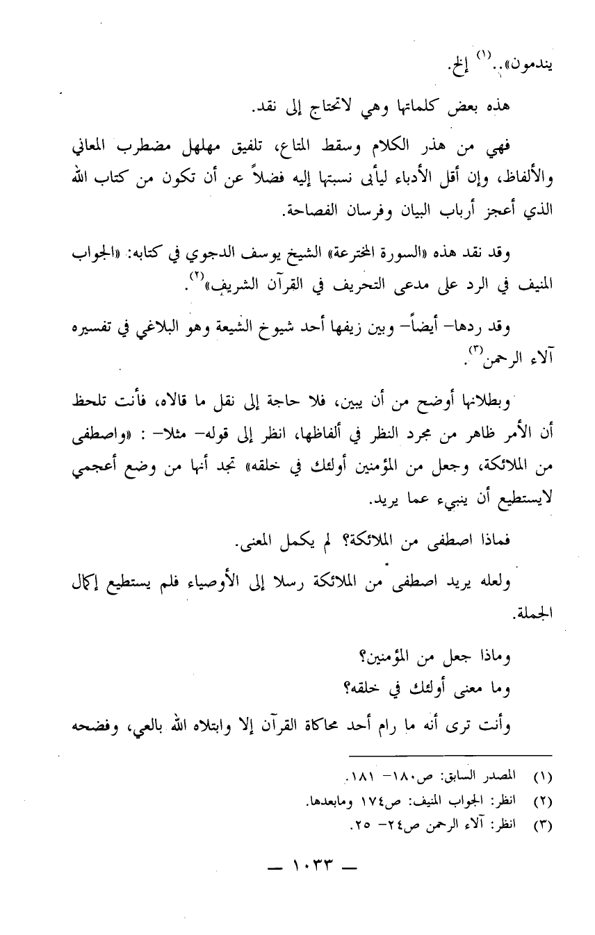 وبطلانها أوضح من أن يبيّن، فلا حاجة إلى نقل ما قالاه، فأنت تلحظ أن الأمر ظاهر من مجرد النظر في ألفاظها، انظر إلى قوله - مثلاً -: "واصطفى من الملائكة، وجعل من المؤمنين أولئك في خلقه" تجد أنها من وضع أعجمي لا يستطيع أن ينبئ عما يريد.