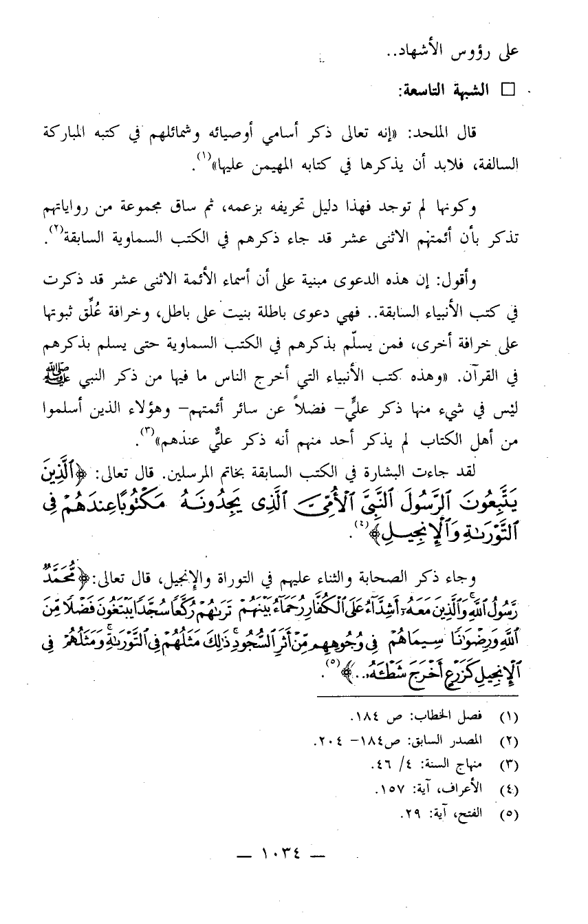 وأقول: إن هذه الدعوى مبنية على أن أسماء الأئمة الاثني عشر قد ذكرت في كتب الأنبياء السابقة.. فهي دعوى باطلة بنيت على باطل، وخرافة عُلِّق ثبوتها على خرافة أخرى، فمن يسلّم بذكرهم في الكتب السماوية حتى يسلم بذكرهم في القرآن! "وهذه كتب الأنبياء التي أخرج الناس ما فيها من ذكر النبي صلى الله عليه وسلم ليس في شيء منها ذكر عليٍّ - فضلاً عن سائر أئمتهم - وهؤلاء الذين أسلموا من أهل الكتاب لم يذكر أحد منهم أنه ذكر عليٌّ عندهم" (¬3) .