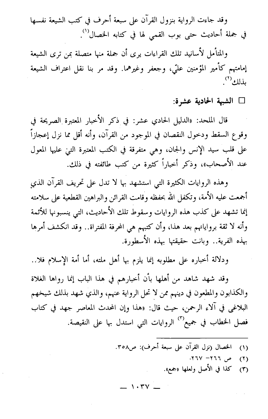 قال الملحد: "الدليل الحادي عشر: في ذكر الأخبار المعتبرة الصريحة في وقوع السقط ودخول النقصان في الموجود من القرآن، وأنه أقل مما نزل إعجازاً على قلب سيد الإنس والجان، وهي متفرقة في الكتب المعتبرة التي عليها المعول عند الأصحاب"، وذكر أخباراً كثيرة من كتب طائفته في ذلك.