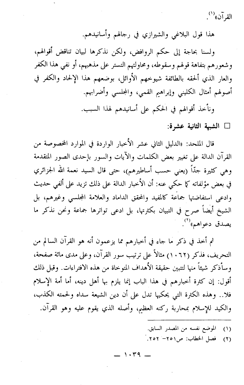 قال الملحد: "الدليل الثاني عشر الأخبار الواردة في الموارد المخصوصة من القرآن الدالة على تغيير بعض الكلمات والآيات والسور بإحدى الصور المتقدمة وهي كثيرة جداً (يعني حسب أساطيرهم) ، حتى قال السيد نعمة الله الجزائري في بعض مؤلفاته كما حكي عنه: أن الأخبار الدالة علي ذلك تزيد على ألفي حديث وادعى استفاضتها جماعة كالمفيد والمحقق الداماد والعلامة المجلسي وغيرهم، بل الشيخ أيضاً صرح في التبيان بكثرتها، بل ادعى تواترها جماعة ونحن نذكر ما يصدق دعواهم" (¬2) .