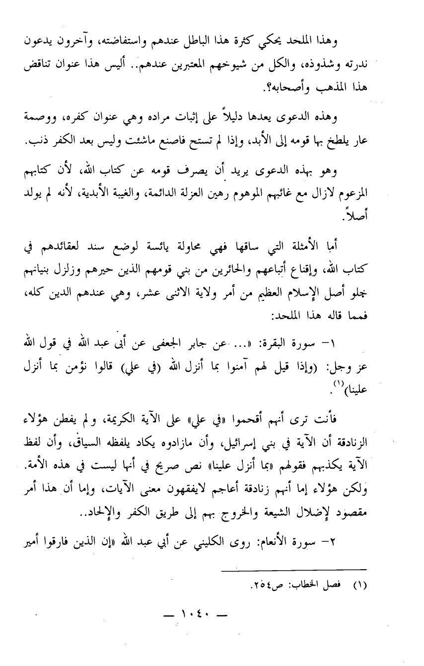 فأنت ترى أنهم أقحموا "في علي" على الآية الكريمة، ولم يفطن هؤلاء الزنادقة أن الآية في بني إسرائيل، وأن ما زادوه يكاد يلفظه السياق، وأن لفظ الآية يكذبهم؛ فقولهم: "بما أنزل علينا" نص صريح في أنها ليست في هذه الأمة. ولكن هؤلاء إما أنهم زنادقة أعاجم لا يفقهون معنى الآيات، وإما أن هذا أمر مقصود لإضلال الشيعة والخروج بهم إلى طريق الكفر والإلحاد..