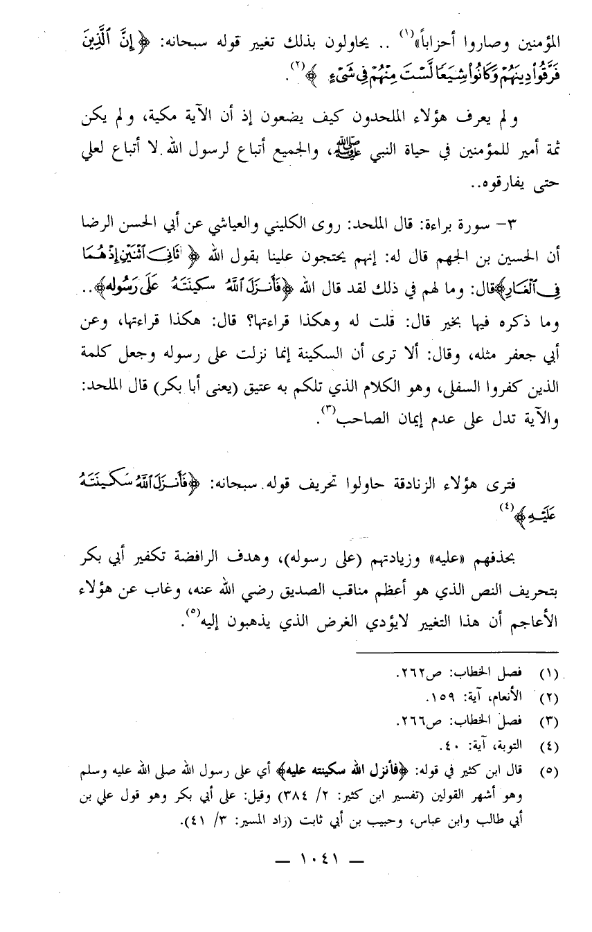 3 ـ سورة براءة: قال الملحد: "روى الكليني والعياشي عن أبي الحسن الرضا أن الحسين بن الجهم قال له: إنهم يحتجون علينا بقول الله: {ثَانِيَ اثْنَيْنِ إِذْ هُمَا فِي الْغَارِ} قال: وما لهم في ذلك، لقد قال الله: (فأنزل الله سكينته على رسوله) .. وما ذكر فيها بخير قال: قلت له: وهكذا قراءتها؟ قال: هكذا قراءتها، وعن أبي جعفر مثله، ألا ترى أن السكينة إنما نزلت على رسوله وجعل كلمة الذين كفروا السفلى، وهو الكلام الذي تكلم به عتيق (يعني أبا بكر) ". قال الملحد: "والآية تدل على عدم إيمان الصاحب" (¬3) .