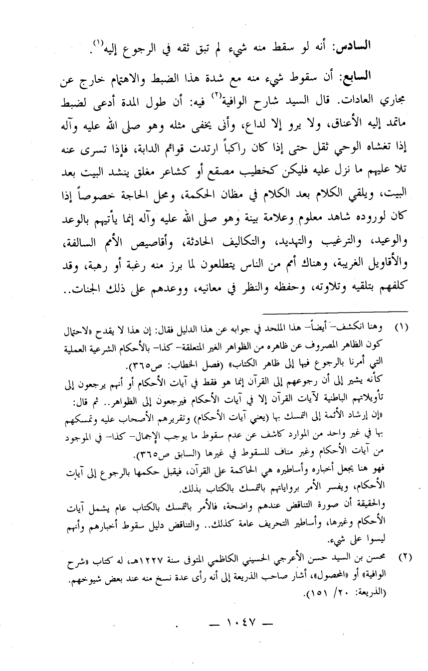 (¬1) وهنا انكشف - أيضاً - هذا الملحد في جوابه عن هذا الدليل فقال: إن هذا لا يقدح "لاحتمال كون الظاهر المصروف عن ظاهر من الظواهر الغير المتعلقة - كذلك - بالأحكام الشرعية العملية التي أمرنا بالرجوع فيما إلى ظاهر الكتاب" (فصل الخطاب: ص365) .