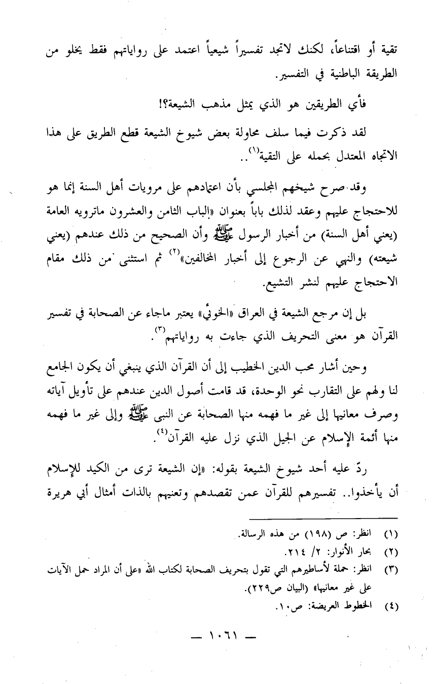 (¬3) انظر: حملة لأساطيرهم التي تقول بتحريف الصحابة لكتاب الله "على أن المراد حمل الآيات على غير معانيها" (البيان ص229)
