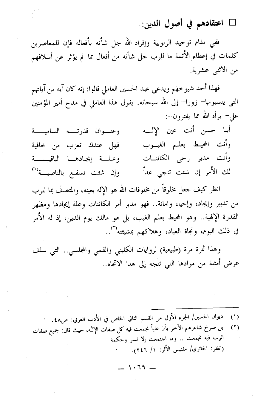 فهذا أحد شيوخهم ويدعى عبد الحسين العاملي قالوا: إنه كان آية من آياتهم التي ينسبونها - زوراً - إلى الله سبحانه. يقول هذا العاملي في مدح أمير المؤمنين علي - برأه الله مما يفترون -: