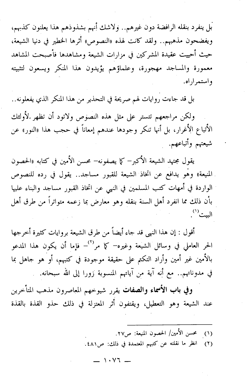 يقول مجتهد الشيعة الأكبر - كما يصفونه - محسن الأمين في كتابه "الحصون المنيعة" وهو يدافع عن اتخاذ الشيعة للقبور مساجد.. يقول في رده للنصوص الواردة في أمهات كتب المسلمين في النهي عن اتخاذ القبور مساجد والبناء عليها بأن ذلك مما انفرد أهل السنة بنقلة وهو معارض بما زعمه متواتراً من طرق أهل البيت (¬1) .