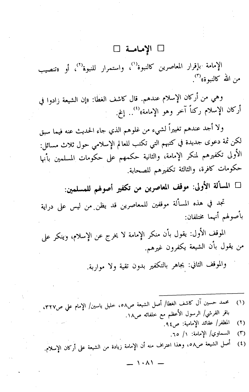 وهي من أركان الإسلام عندهم. قال كاشف الغطا: "إن الشيعة زادوا في أركان الإسلام ركناً آخر وهو الإمامة" (¬4) .. إلخ.