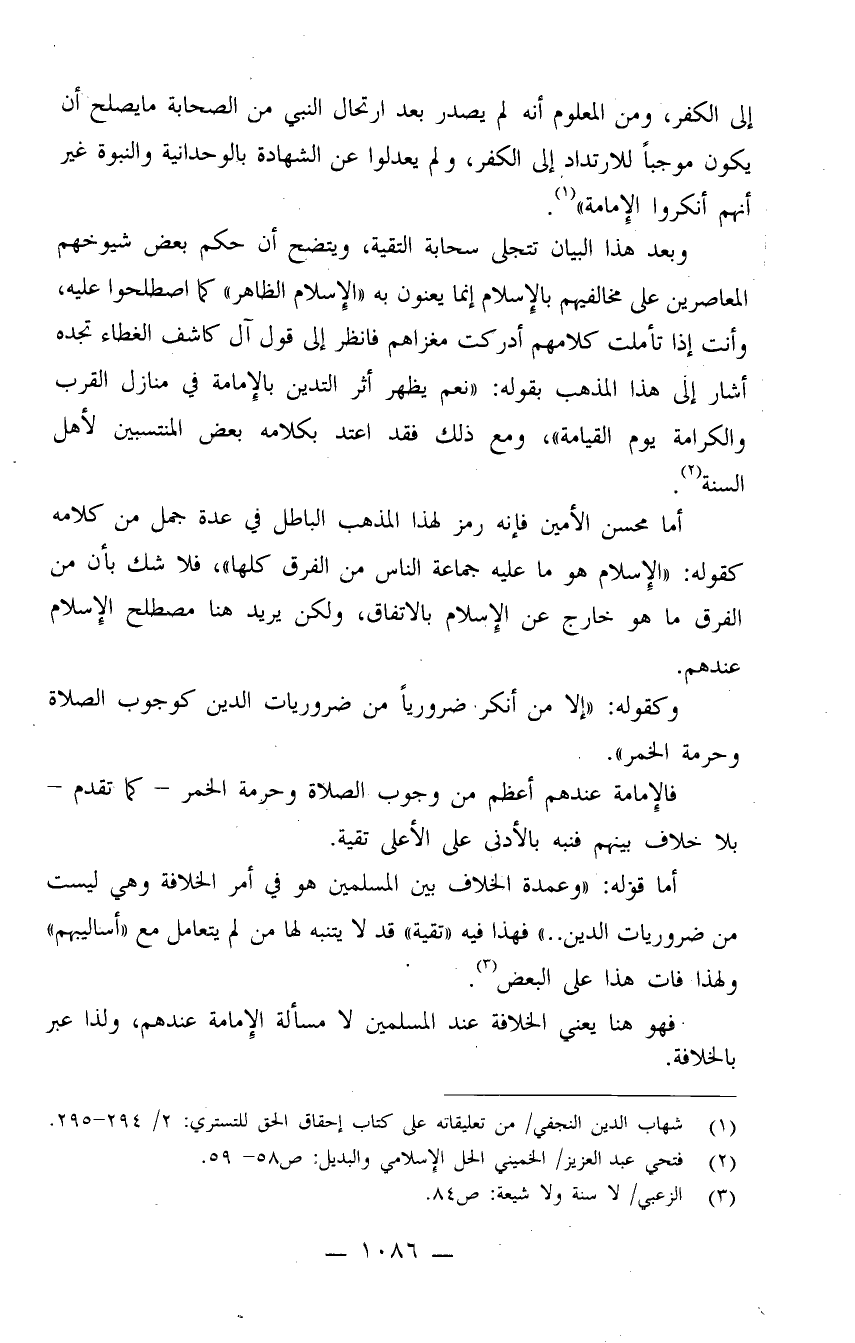 أما قوله: "وعمدة الخلاف بين المسلمين هو في أمر الخلافة وهي ليست من ضروريات الدين.." فهذا فيه "تقية" قد لا يتنبه لها من لم يتعامل مع "أساليبهم" ولهذا فات هذا على البعض (¬3) .