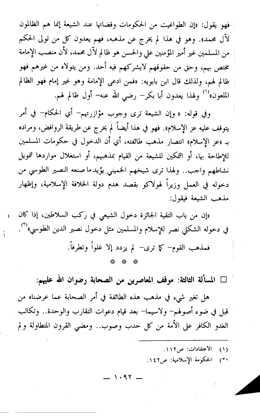 وفي قوله: "وإن الشيعة ترى وجوب مؤازرتهم - أي الحكام - في أمر يتوقف عليه عز الإسلام". فهو في هذا أيضاً لم يخرج عن طريقة الروافض، ومراده بـ"عز الإسلام" انتصار مذهب طائفته، أي أن الدخول في حكومات المسلمين للإطاحة بها، أو التمكين للشيعة من القيام بمذهبهم، أو استغلال مواردها لتمويل نشاطهم واجب.. ولهذا ترى شيخهم الخميني يؤيد ما صنعه النصير الطوسي من دخوله في العمل وزيراً لهولاكو بقصد هدم دول الخلافة الإسلامية، وإظهار مذهب الشيعة فيقول: