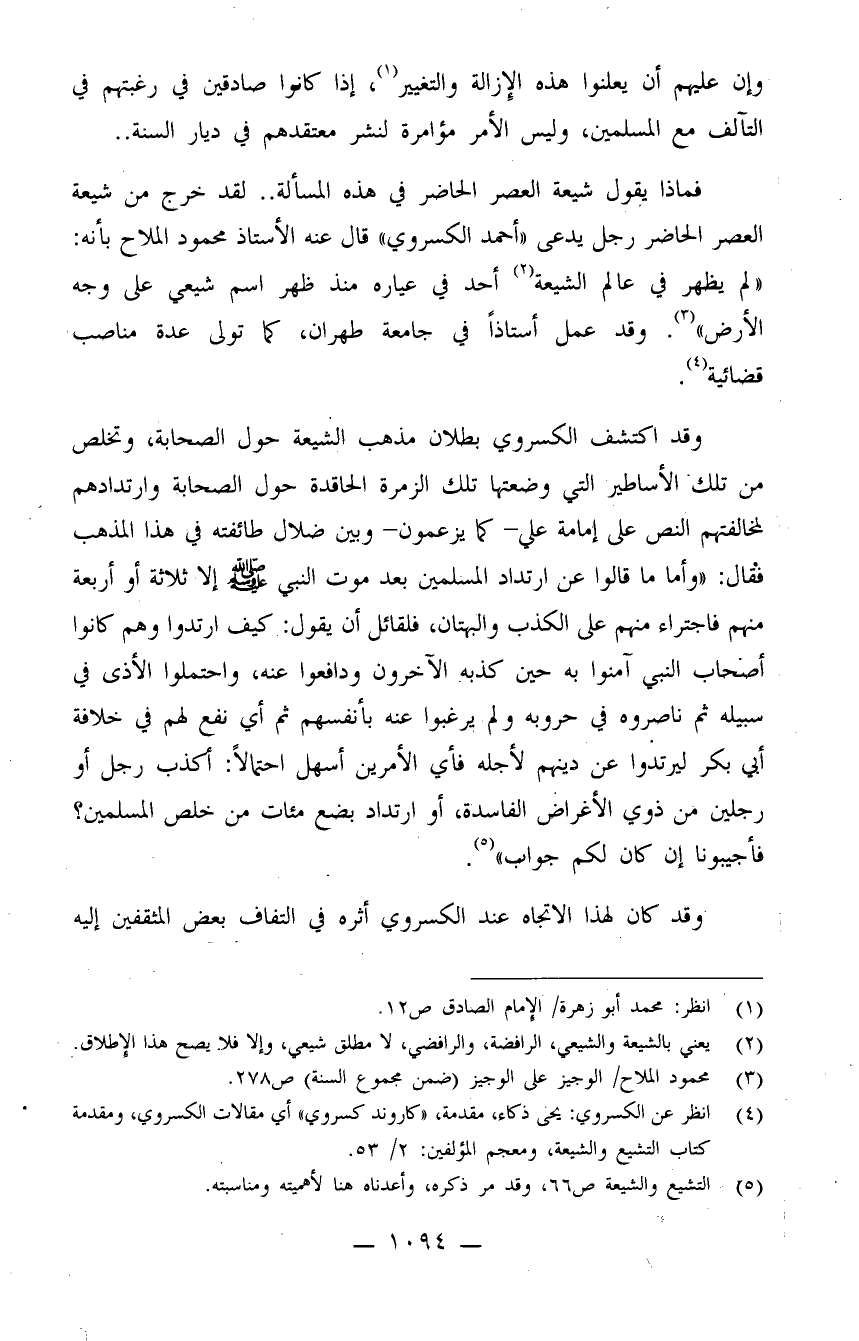 فماذا يقول شيعة العصر الحاضر في هذه المسألة؟ لقد خرج من شيعة العصر الحاضر رجل يدعى "أحمد الكسروي" قال عنه الأستاذ محمود الملاح بأنه: "لم يظهر في عالم الشيعة (¬2) . أحد في عياره منذ ظهور اسم شيعي على وجه الأرض" (¬3) . وقد عمل أستاذاً في جامعة طهران، كما تولى عدة مناصب قضائية (¬4) .