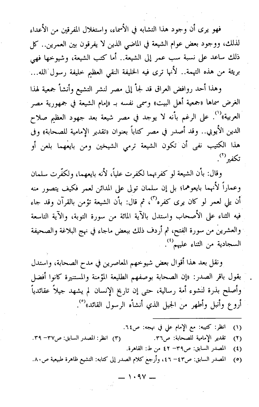 (¬5) تقدير الإمامية للصحابة: ص43-46، وأرجع كلام الصدر إلى كتابه: التشيع ظاهرة طبيعية ص80