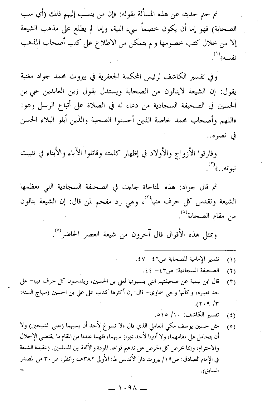 وفي تفسير الكاشف لرئيس المحكمة الجعفرية في بيروت محمد جواد مغنية يقول: إن الشيعة لا ينالون من الصحابة، ويستدل بقوة زين العابدين علي بن الحسين في الصحيفة السجادية من دعاء له في الصلاة على أتباع الرسل وهو: "اللهم وأصحاب محمد خاصة الذين أحسنوا الصحبة والذين أبلو البلاء الحسن في نصره.. وفارقوا الأزواج والأولاد في إظهار كلمته وقاتلوا الآباء والأبناء في تثبيت نبوته.." (¬2) .
