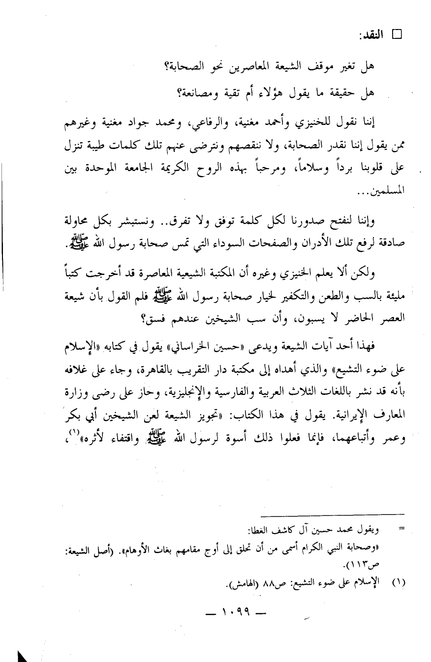 إننا نقول للخنيزي وأحمد مغنية، والرفاعي، ومحمد جواد مغنية وغيرهم ممن يقول إننا نقدر الصحابة، ولا ننقصهم ونترضى عنهم: تلك كلمات طيبة تنزل على قلوبنا برداً وسلاماً، ومرحباً بهذه الروح الكريمة الجامعة الموحدة بين المسلمين.