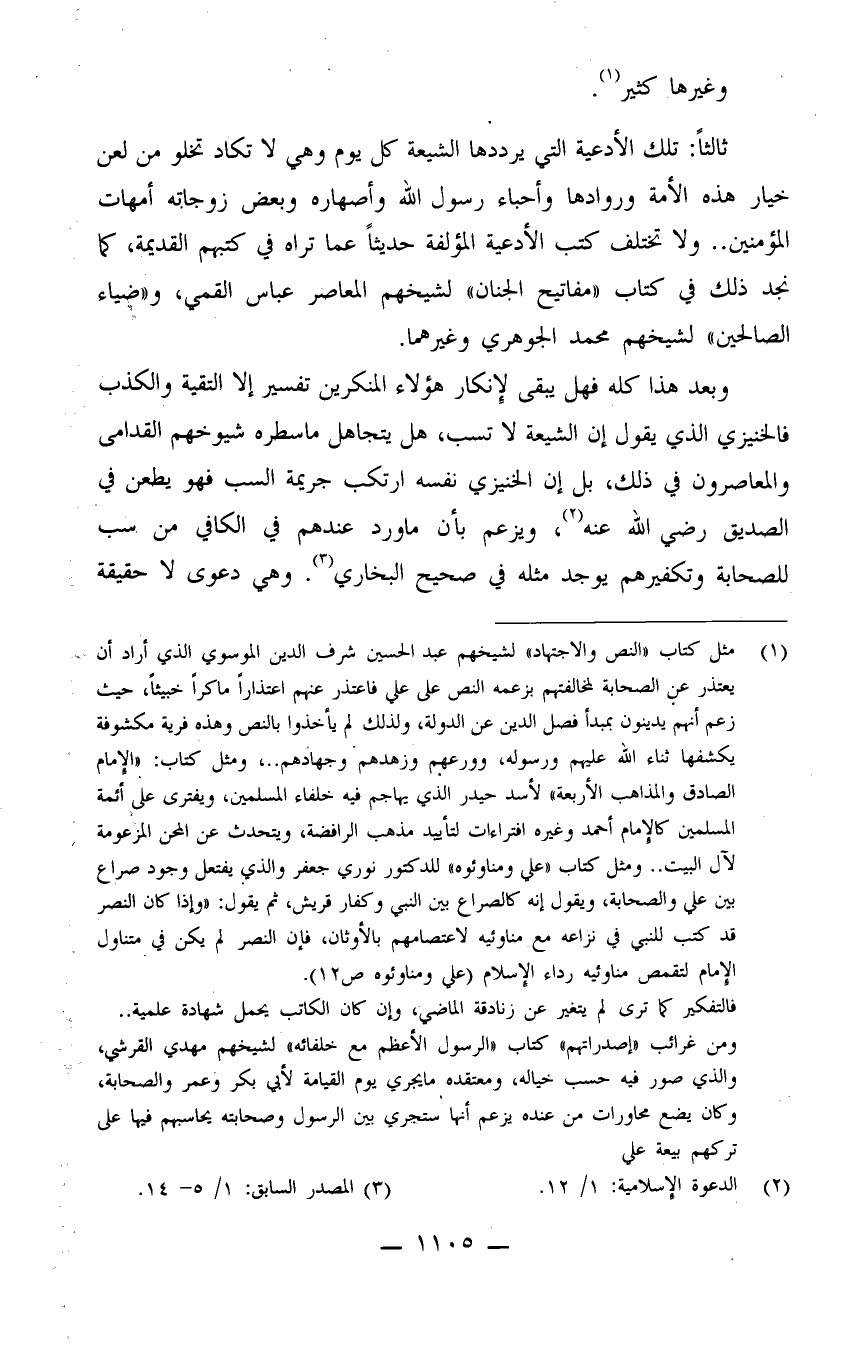 (¬1) مثل كتاب "النص والاجتهاد" لشيخهم عبد الحسين شرف الدين الموسوي الذي أراد أن يعتذر عن الصحابة لمخالفتهم - بزعمه - النص على علي فاعتذر عنهم اعتذاراً ماكراً خبيثاً، حيث زعم أنهم يدينون بمبدأ فصل الدين عن الدولة، ولذلك لم يأخذوا بالنص وهذه فرية مكشوفة يكشفها ثناء الله عليهم ورسوله، وورعهم وزهدهم وجهادهم، ومثل كتاب: "الإمام الصادق والمذاهب الأربعة" لأسد حيدر الذي يهاجم فيه خلفاء المسلمين، ويفتري على أئمة المسلمين كالإمام أحمد وغيره افتراءات لتأييد مذهب الرافضة، ويتحدث عن المحن المزعومة لآل البيت. ومثل كتاب "علي ومناوئوه" للدكتور نوري جعفر والذي يفتعل وجود صراع بين علي والصحابة، ويقول إنه كالصراع بين النبي وكفار قريش، يقول: "وإذا كان النصر قد كتاب للنبي في نزاعه مع مناوئيه لاعتصامهم بالأوثان، فإن النصر لم يكن في متناول الإمام لتقمص مناوئيه رداء الإسلام" (علي ومناوئوه ص12) .