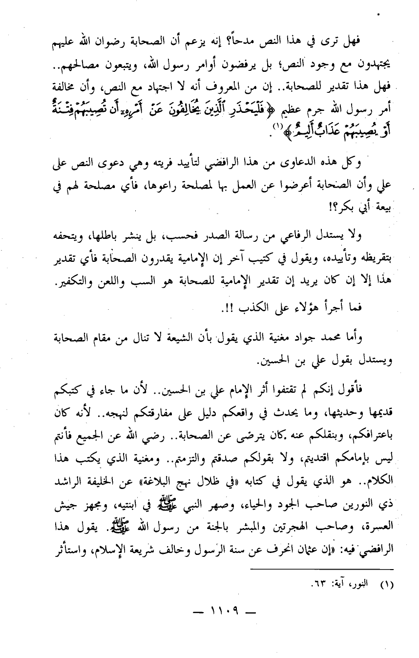 فأقول: إنكم لم تقتفوا أثر الإمام علي بن الحسين..؛ لأن ما جاء في كتبكم قديمها وحديثها، وما يحدث في واقعكم دليل على مفارقتكم لنهجه..؛ لأنه كان باعترافكم، وبنقلكم عنه، كان يترضى عن الصحابة.. رضي الله عن الجميع، فأنتم ليس بإمامكم اقتدتم، ولا بقولكم صدقتم والتزمتم.. ومغنية الذي يكتب هذا الكلام.. هو الذي يقول في كتابه "في ظلال نهج البلاغة" عن الخليفة الراشد ذي النورين صاحب الجود والحياء، وصهر النبي صلى الله عليه وسلم في ابنتيه، ومجهز جيش العسرة، وصاحب الهجرتين والمبشر بالجنة من رسول الله صلى الله عليه وسلم. يقول هذا الرافضي فيه:" إن عثمان انحرف عن سنة الرسول وخالف شريعة الإسلام، واستأثر