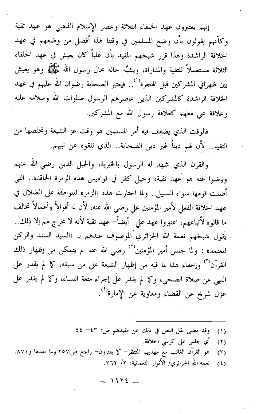 والقرن الذي شهد له الرسول بالخيرية، والجيل الذين رضي الله عنهم ورضوا عنه هو عهد تقية، وجيل كفر في قواميس هذه الزمرة الحاقدة.. التي أضلت قومها سواء السبيل.. ولما احتارت هذه "الزمر" المتواطئة على الضلال في عهد الخلافة الفعلي لأمير المؤمنين علي رضي الله عنه، لأن له أقوالاً وأعمالاً تخالف ما قالوه لأتباعهم، اعتبروا عهد علي - أيضاً - عهد تقية لأنه لا مخرج لهم إلا ذلك.. يقول شيخهم نعمة الله الجزائري الموصوف عندهم بـ"السيد السند والركن المعتمد": ولما جلس أمير المؤمنين (¬2) . رضي الله عنه لم يتمكن من إظهار ذلك القرآن (¬3) . وإخفاء هذا لما فيه من إظهار الشيعة على من سبقه كما لم يقدر على النهي عن صلاة الضحى، وكما لم يقدر على إجراء متعة النساء، كما لم يقدر على عزل شريح عن القضاء ومعاوية عن الإمارة (¬4) .