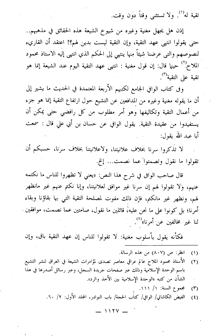 وفي كتاب الوافي الجامع لكتبهم الأربعة المعتمدة في الحديث ما يشير إلى أن ما يقوله مغنية وغيره من المدافعين عن التشيع حول ارتفاع التقية إنما هو جزء من أعمال التقية وتكاليفها وهو أمر مطلوب من كل رافضي حتى يمكن أن يستفيدوا من عقيدة التقية. يقول الوافي: عن حسان بن أبي علي قال: سمعت أبا عبد الله يقول: