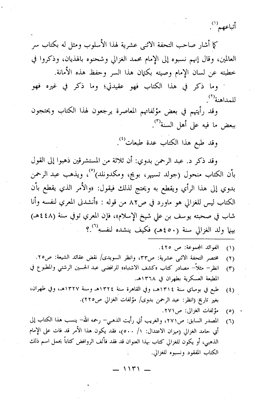 (¬6) مؤلفات الغزالي: ص271، والغريب أني رأيت الذهبي - رحمه الله - ينسب هذا الكتاب إلى أبي حامد الغزالي (ميزان الاعتدال: 1/500) ، فقد يكون هذا الأمر قد فات على الإمام الذهبي، أو يكون للغزالي كتاب بهذا العنوان قد فُقِد فألف الروافض كتاباً يحمل اسم ذلك الكتاب المفقود ونسبوه للغزالي