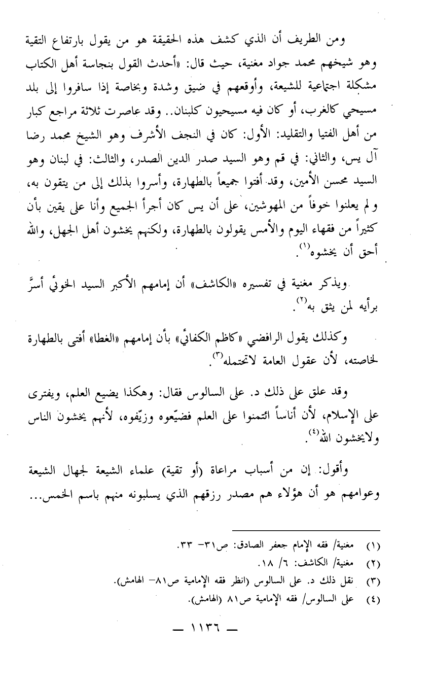 ومن الطريف أن الذي كشف هذه الحقيقة هو من يقول بارتفاع التقية وهو شيخهم محمد جواد مغنية، حيث قال: "أحدث القول بنجاسة أهل الكتاب مشكلة اجتماعية للشيعة، وأوقعهم في ضيق وشدة وبخاصة إذا سافروا إلى بلد مسيحي كالغرب، أو كان فيه مسيحيون كلبنان.. وقد عاصرت ثلاثة مراجع كبار من أهل الفتيا والتقليد: الأول: كان في النجف الأشرف وهو الشيخ محمد رضا آل يس، والثاني: في قم وهو السيد صدر الدين الصدر. والثالث: في لبنان وهو السيد محسن الأمين، وقد أفتوا جميعاً بالطهارة، وأسروا بذلك إلى من يثقون به، ولم يعلنوا خوفاً من المهوشين، على أن يس كان أجرأ الجميع، وأنا على يقين بأن كثيراً من فقهاء اليوم والأمس يقولون بالطهارة، ولكنهم يخشون أهل الجهل، والله أحق أن يخشوه" (¬1) .