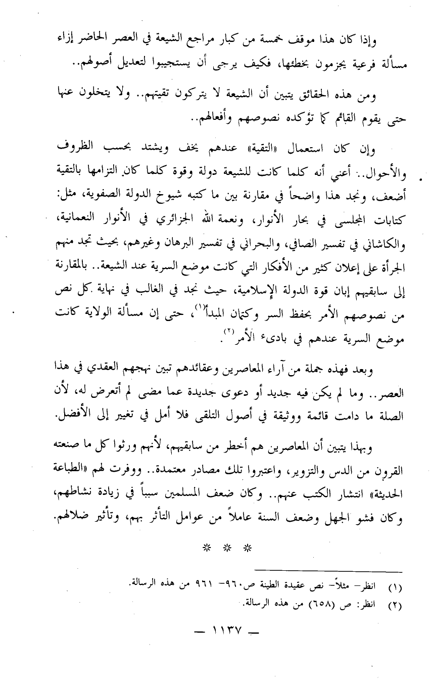 وإن كان استعمال "التقية" عندهم يخف ويشتد بحسب الظروف والأحوال.. أعني أنه كلما كانت للشيعة دولة وقوة كان التزامها بالتقية أضعف، ونجد هذا واضحاً في مقارنة بين ما كتبه شيوخ الدولة الصفوية، مثل: كتابات المجلسي في بحار الأنوار، ونعمة الله الجزائري في الأنوار النعمانية، والكاشاني في تفسير الصافي، والبحراني في تفسير البرهان وغيرهم، بحيث تجد منهم الجرأة على إعلان كثير من الأفكار التي كانت موضع السرية عند الشيعة.. بالمقارنة إلى سابقيهم إبان قوة الدولة الإسلامية، حيث نجد في الغالب في نهاية كل نص من نصوصهم الأمر بحفظ السر وكتمان المبدأ (¬1) . حتى إن مسألة الولاية كانت موضع السرية عندهم في بادئ الأمر (¬2) .