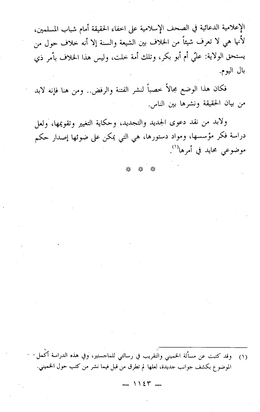 (¬1) وقد كتبت عن مسألة الخميني والتقريب في رسالتي للماجستير، وفي هذه الدراسة أكمل الموضوع بكشف جوانب جديدة، لعلها لم تطرق من قبل فيما نشر من كتب حول الخميني
