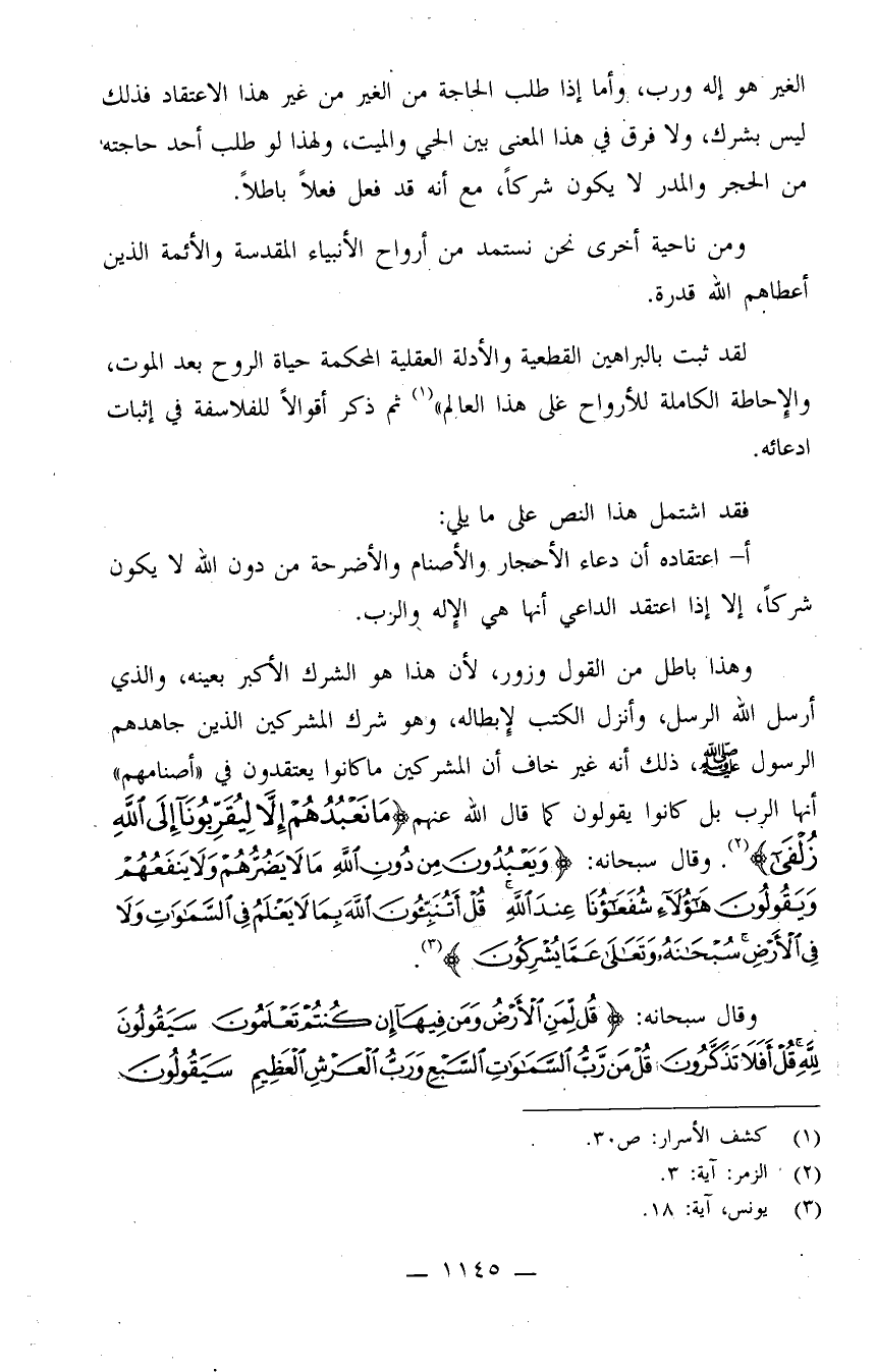 وهذا باطل من القول وزور؛ لأن هذه هو الشرك الأكبر بعينه، والذي أرسل الله الرسل، وأنزل الكتب لإبطاله، وهو شرك المشركين الذين جاهدهم الرسول صلى الله عليه وسلم، ذلك أنه غير خاف أن المشركين ما كانوا يعتقدون في "أصنامهم" أنها الرب بل كانوا يقولون كما قال الله عنهم: {مَا نَعْبُدُهُمْ إِلا لِيُقَرِّبُونَا إِلَى اللَّهِ زُلْفَى} (¬2) . وقال سبحانه: {وَيَعْبُدُونَ مِن دُونِ اللَّهِ مَا لاَ يَضُرُّهُمْ وَلاَ يَنفَعُهُمْ وَيَقُولُونَ هَؤُلاءِ شُفَعَاؤُنَا عِندَ اللَّهِ قُلْ أَتُنَبِّئُونَ اللَّهَ بِمَا لاَ يَعْلَمُ فِي السَّمَاوَاتِ وَلاَ فِي الأَرْضِ سُبْحَانَهُ وَتَعَالَى عَمَّا يُشْرِكُونَ} (¬3) .