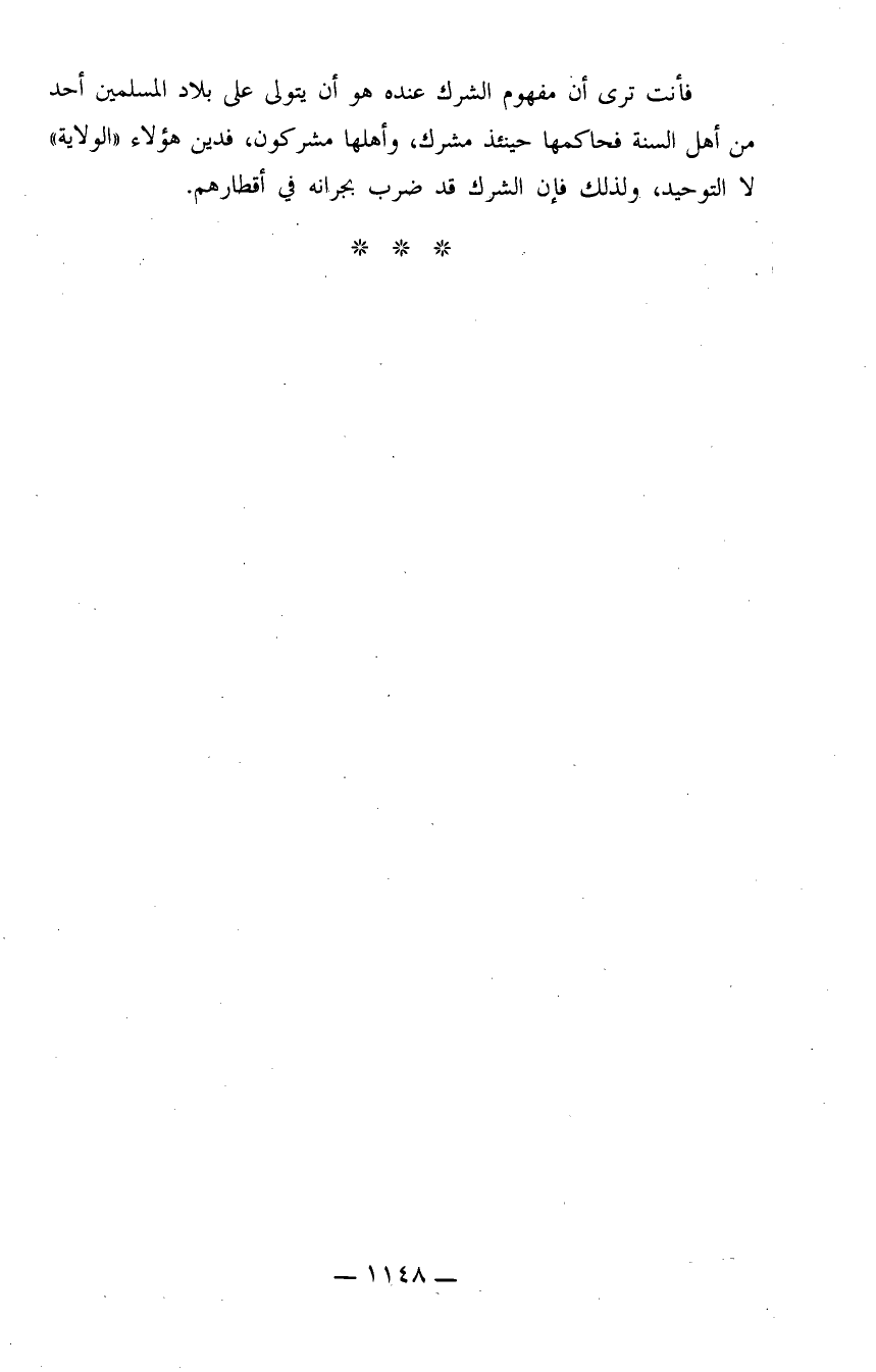 فأنت ترى أن مفهوم الشرك عنده هو أن يتولى على بلاد المسلمين أحد من أهل السنة فحاكمها حينئذ مشرك، وأهلها مشركون، فدين هؤلاء "الولاية" لا التوحيد، ولذلك فإن الشرك قد ضرب بجرانه في أقطارهم.