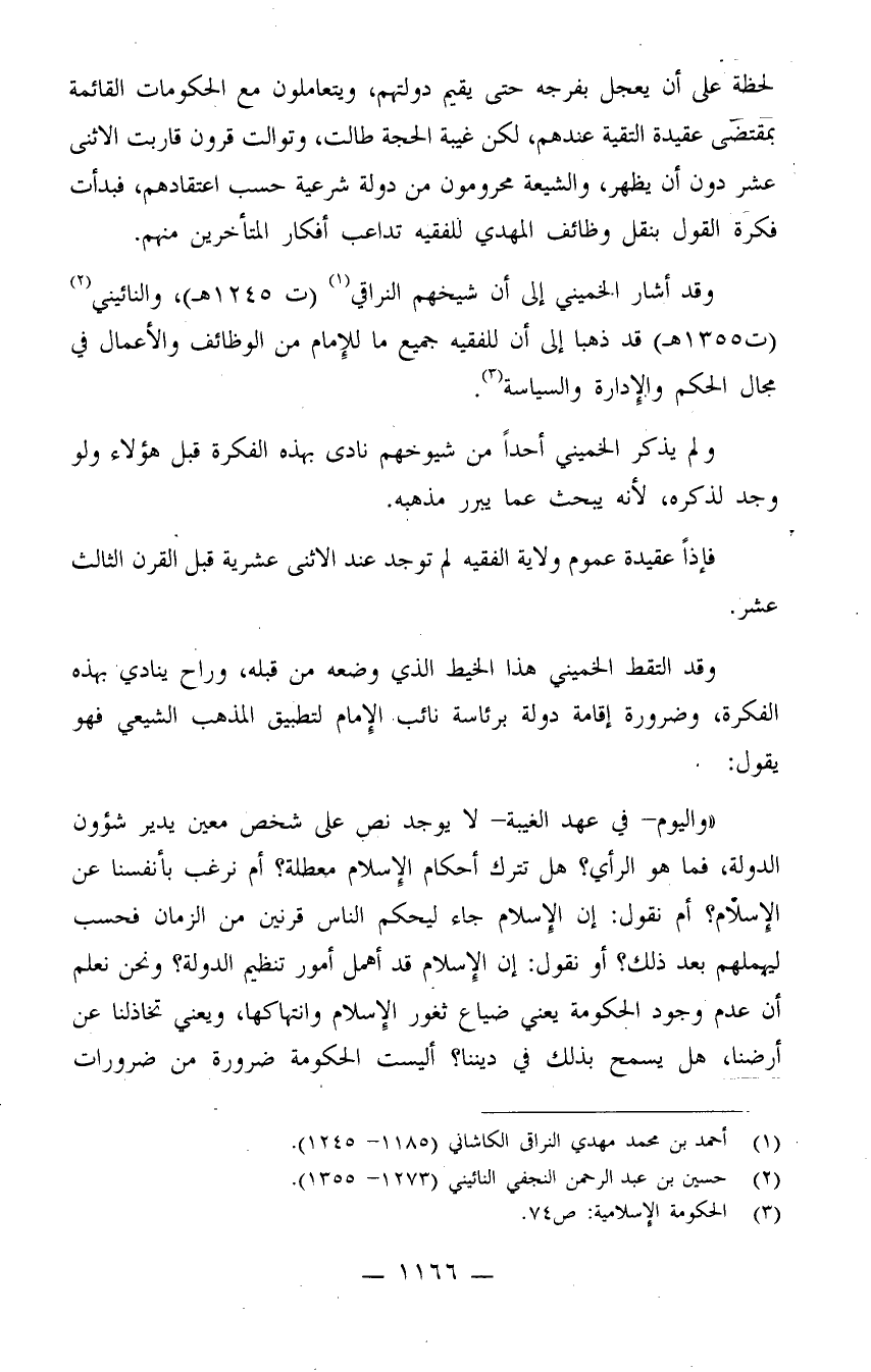 وقد التقط الخميني هذا الخيط الذي وضعه من قبله، وراح ينادي بهذه الفكرة، وضرورة إقامة دولة برئاسة نائب الإمام لتطبيق المذهب الشيعي، فهو يقول: "واليوم - في عهد الغيبة - لا يوجد نص على شخص معين يدير شؤون الدولة، فما هو الرأي؟ هل تترك أحكام الإسلام معطلة؟ أم نرغب بأنفسنا عن الإسلام؟ أم نقول: إن الإسلام جاء ليحكم الناي قرنين من الزمان فحسب ليهملهم بعد ذلك؟ أو نقول: إن الإسلام قد أهمل أمور تنظيم الدولة؟ ونحن نعلم أن عدم وجود الحكومة يعني ضياع ثغور الإسلام وانتهاكها، ويعني تخاذلنا عن أرضنا، هل يسمح بذلك في ديننا؟ أليست الحكومة ضرورة من ضرورات