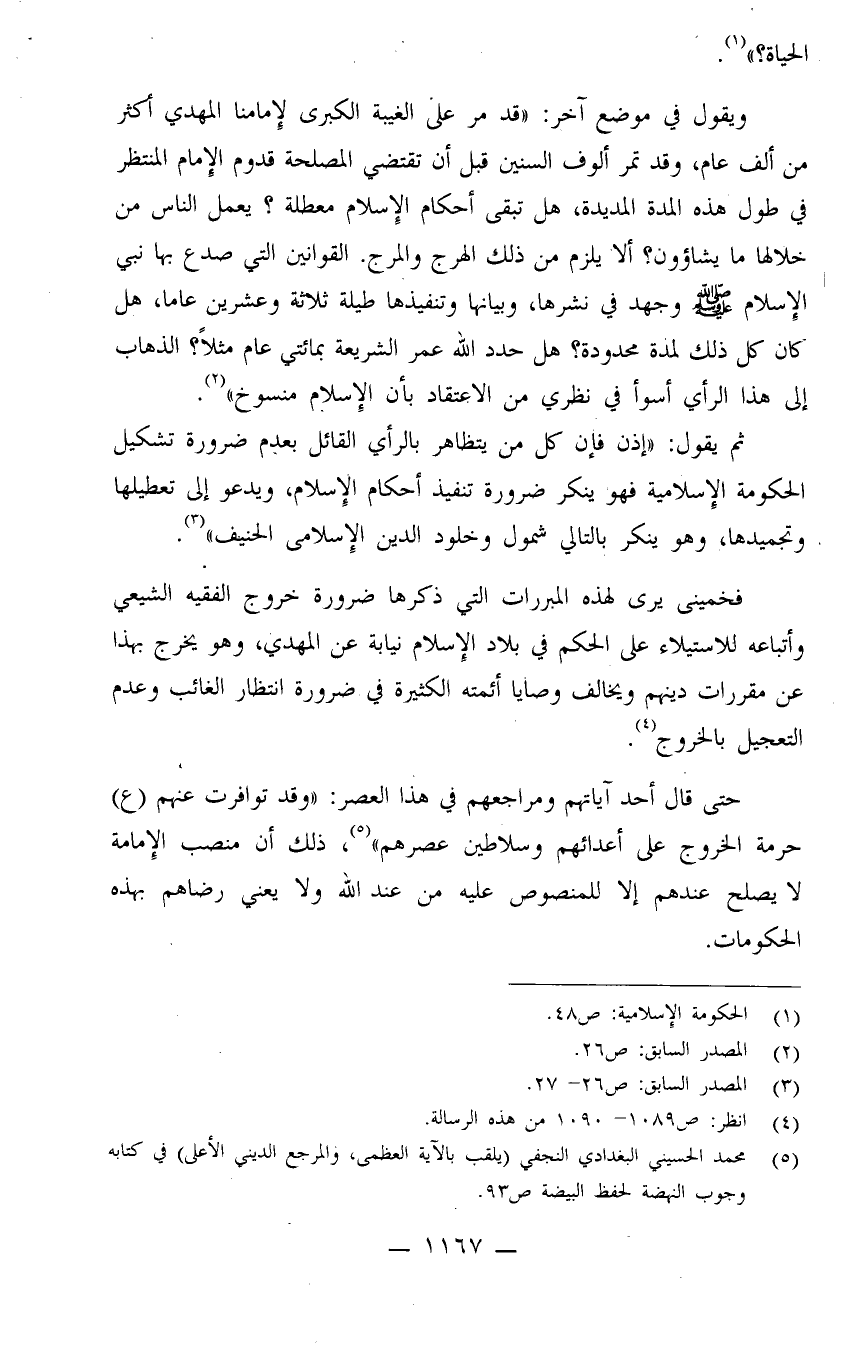 فخميني يرى لهذه المبرارات التي ذكرها خروج الفقيه الشيعي وأتباعه للاستيلاء على الحكم في بلاد الإسلام نيابة عن المهدي، وهو يخرج بهذا عن مقررات دينهم ويخالف وصايا أئمته الكثيرة في ضرورة انتظار الغائب وعدم التعجيل بالخروج (¬4) .