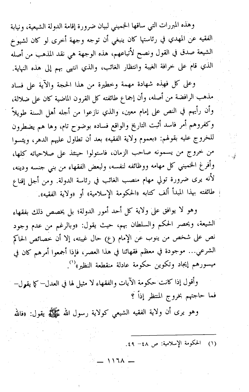 وعلى كل فهذه شهادة مهمة وخطيرة من هذه الحجة والآية على فساد مذهب الرافضة من أصله، وأن إجماع طائفته كل القرون الماضية كان على ضلالة، وأن رأيهم في النص على إمام معين، والذي نازعوا من أجله أهل السنة طويلاً وكفروهم أمر فاسد أثبت التاريخ والواقع فساده بوضوح تام، وهاهم يضطرون للخروج عليه بقوله: "بعموم ولاية الفقيه" بعد أن تطاول عليهم الدهر، ويئسوا من خروج من يسمونه "صاحب الزمان"، فاستولوا حينئذ على صلاحياته كلها، وأفرغ الخميني كل مهامه ووظائفه لنفسه، ولبعض الفقهاء من بني جنسه ودينه، لأنه يرى ضرورة تولي مهام منصب الغائب في رئاسة الدولة. ومن أجل إقناع طائفته بهذا المبدأ ألف كتابه "الحكومة الإسلامية" أو "ولاية الفقيه".