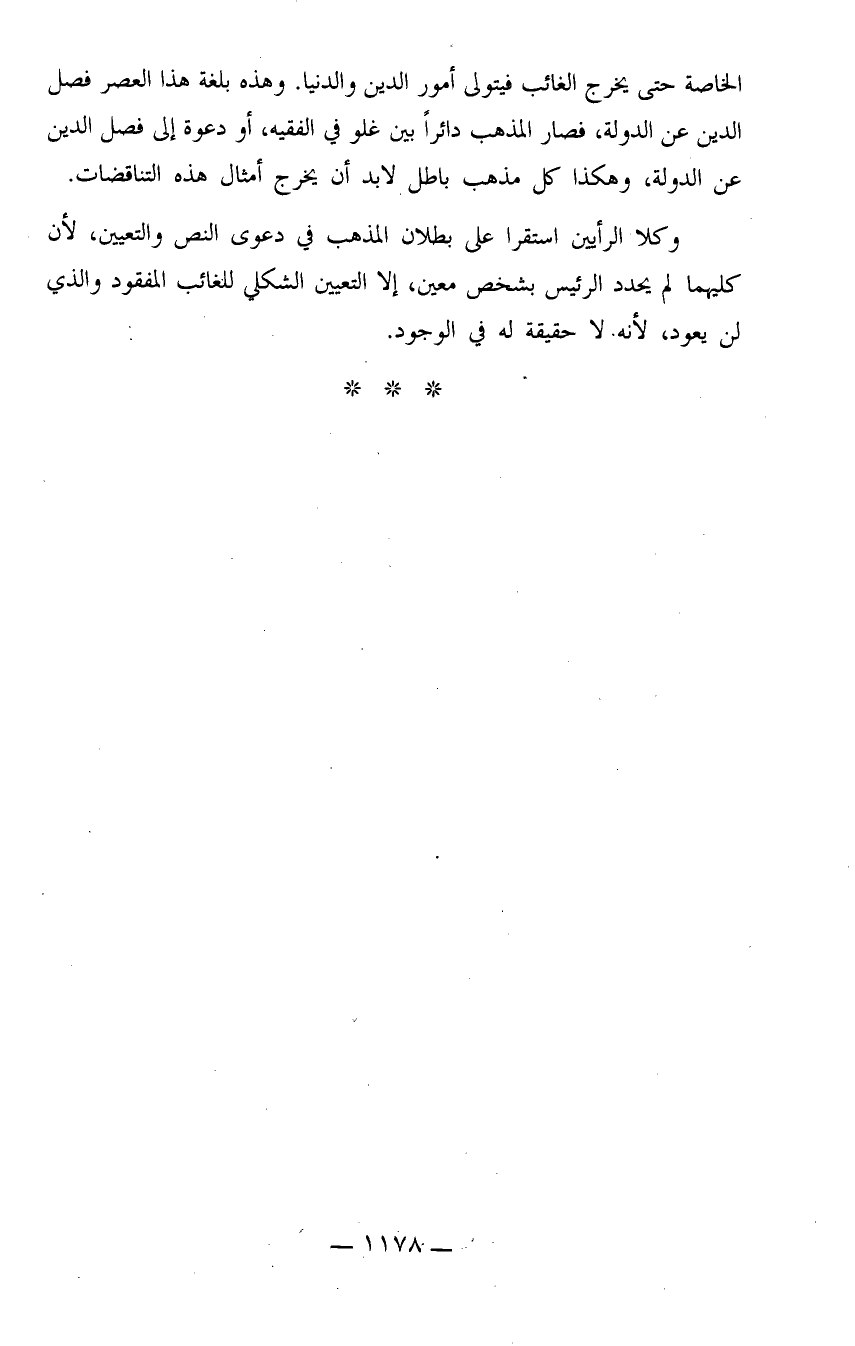 الخاصة حتى يخرج الغائب فيتولى أمور الدين والدينا. وهذه بلغة هذا العصر فصل الدين عن الدولة، فصار المذهب دائراً بين غلو في الفقيه، أو دعوة إلى فصل الدين عن الدولة، وهكذا كل مذهب باطل لابد أن يخرج أمثال هذه التناقضات.