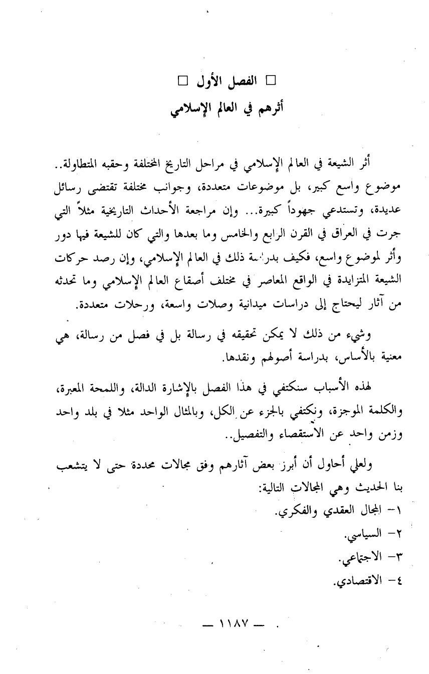 أثر الشيعة في العالم الإسلامي في مراحل التاريخ المختلفة وحقبه المتطاولة.. موضوع واسع كبير، بل موضوعات متعددة، وجوانب مختلفة تقتضي رسائل عديدة، وتستدعي جهوداً كبيرة.. وإن مراجعة الأحداث التاريخية - مثلاً - التي جرت في العراق في القرن الرابع والخامس وما بعدها والتي كان للشيعة فيها دور وأثر لموضوع واسع، فيكف بدراسة ذلك في العالم الإسلامي، وإن رصد حركات الشيعة المتزايدة في الواقع المعاصر في مختلف أصقاع العالم الإسلامي وما تحدثه من آثار ليحتاج إلى دراسات ميدانية وصلات واسعة، ورحلات متعددة.
