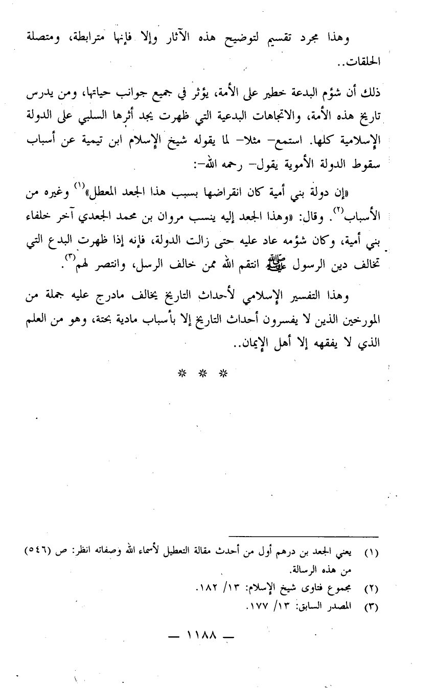 "إن دولة بني أمية كان انقراضها بسبب هذا الجعد المعطل" (¬1) . وغيره من الأسباب (¬2) . وقال: "وهذا الجعد إليه ينسب مروان بن محمد الجعدي آخر خلفاء بني أمية، وكان شؤمه عاد عليه حتى زالت الدولة، فإنه إذا ظهرت البدع التي تخالف دين الرسول صلى الله عليه وسلم انتقم الله ممن خالف الرسل، وانتصر لهم" (¬3) .