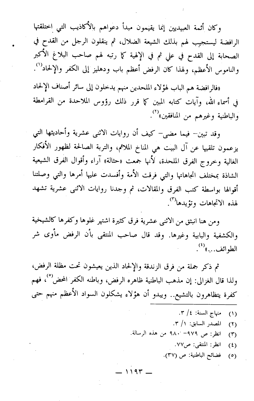 ثم ذكر جملة من فرق الزندقة والإلحاد الذين يعيشون تحت مظلة الرفض، ولذا قال الغزالي: "إن مذهب الباطنية ظاهره الرفض، وباطنه الكفر المحض" (¬5) .