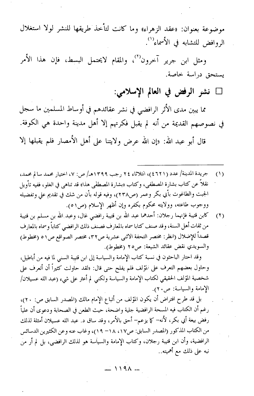 (¬1) جريدة المدينة/ عدد (4621) الثلاثاء 24 رجب 1399هـ، ص: 7، اختيار محمد سالم محمد، نقلاً عن كتاب بشارة المصطفى، وكتاب "بشارة المصطفى" هذا قد تناهى في الغلو، ففيه تأويل الجبت والطاغوت بأبي بكر وعمر (ص238) ، وفيه قوله بأن من شك في تقديم علي وتفضيله ووجوب طاعته، وولايته محكوم بكفره وإن أظهر الإسلام (ص51)