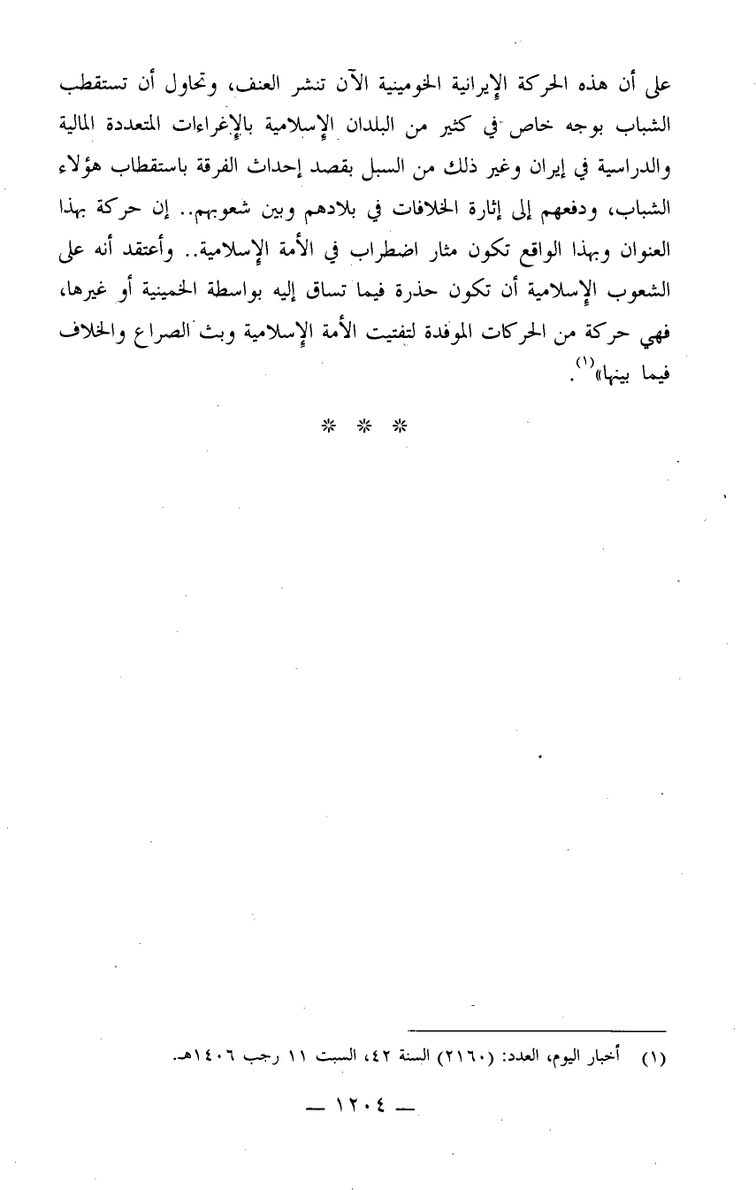 على أن هذه الحركة الإيرانية الخومينية الآن تنشر العنف، وتحاول أن تستقطب الشباب بوجه خاص في كثير من البلدان الإسلامية بالإغراءات المتعددة المالية والدراسية في إيران وغير ذلك من السبل بقصد إحداث الفرقة باستقطاب هؤلاء الشباب، ودفعهم إلى إثارة الخلافات في بلادهم وبين شعوبهم.. وأعتقد أنه على الشعوب الإسلامية أن تكون حذرة فيما تساق إليه بواسطة الخمينية أو غيرها، فهي حركة من الحركات الموفدة لتفتيت الأمة الإسلامية وبث الصراع والخلاف فيما بينها" (¬1) .