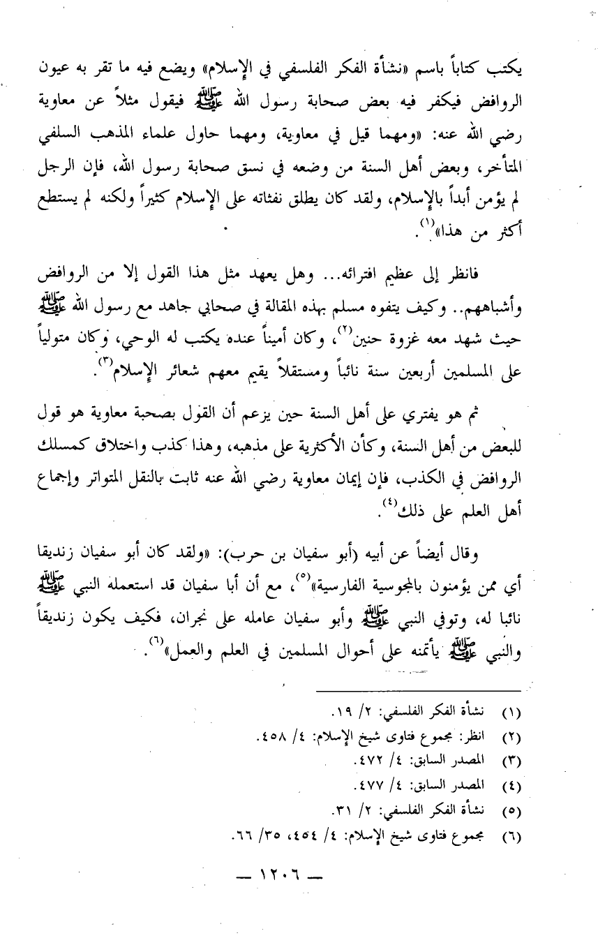 فانظر إلى عظيم افترائه.. وهل يعهد مثل هذا القول إلا من الروافض وأشباههم.. وكيف يتفوه مسلم بهذه المقالة في صحابي جاهد مع رسول الله صلى الله عليه وسلم حيث شهد معه غزوة حنين (¬2) ، وكان أميناً عنده يكتب له الوحي، وكان متولياً على المسلمين أربعين سنة نائباً ومستقلاً يقيم معهم شعائر الإسلام (¬3) .؟.