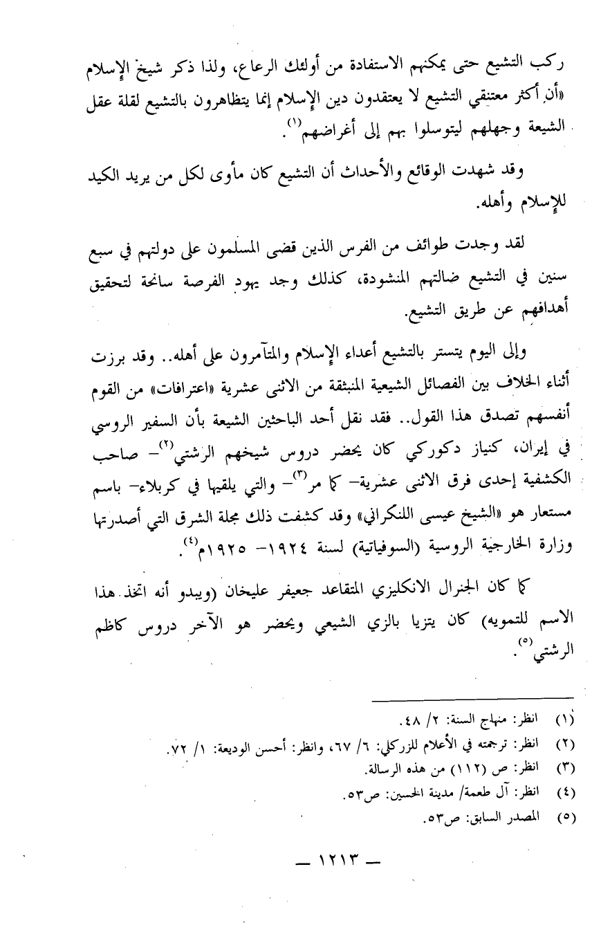 وإلى اليوم يتستر بالتشيع أعداء الإسلام والمتآمرين على أهله.. وقد برزت أثناء الخلاف بين الفصائل الشيعية المنبثقة من الاثني عشرية "اعترافات" من القوم أنفسهم تصدق هذا القول.. فقد نقل أحد الباحثين الشيعة بأن السفير الروسي في إيران - كنياز دكوركي كان يحضر دروس شيخهم الرشتي (¬2) . صاحب الكشفية إحدى فرق الاثني عشرية - كما مر (¬3) .- والتي يلقيها في كربلاء باسم مستعار هو "الشيخ عيسى اللنكراني" وقد كشفت ذلك مجلة الشرق التي أصدرتها وزارة الخارجية الروسية (السوفياتية) لسنة 1924-1925م (¬4) .