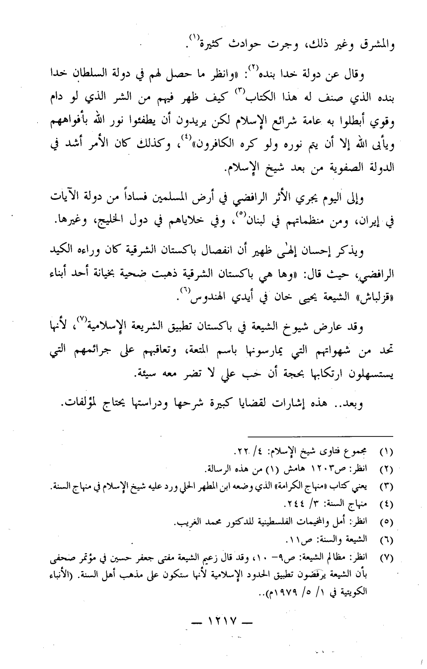 (¬7) انظر: مظالم الشيعة: ص 9-10، وقد قال زعيم الشيعة مفتي جعفر حسين في مؤتمر صحفي بأن الشيعة يرفضون تطبيق الحدود الإسلامية لأنها ستكون على مذهب أهل السنة. (الأبناء الكويتية في 1/5/1979م)
