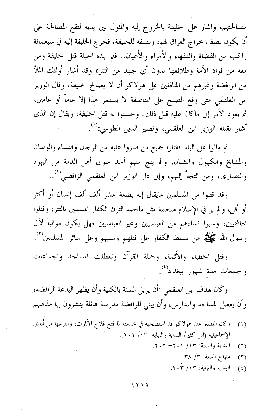 مصالحتهم، وأشار على الخليفة بالخروج إليه والمثول بين يديه لتقع المصالحة على أن يكون نصف خراج العراق لهم، ونصفه للخليفة، فخرج الخليفة إليه في سبعمائة راكب من القضاة والفقهاء والأمراء والأعيان.. فتم بهذه الحيلة قتل الخليفة ومعن معه من قواد الأمة وطلائعها بدون أي جهد من التتر. وقد أشار أولئك الملأ من الرافضة وغيرهم على المنافقين على هولاكو أن لا يصالح الخليفة، وقال الوزير ابن العلقمي: متى وقع الصلح على المناصفة لا يستمر هذا إلا عاماً أو عامين، ثم يعود الأمر إلى ما كان عليه قبل ذلك، وحسنوا له قتل الخليفة، ويقال إن الذي أشار بقتله الوزير ابن العلقمي، ونصير الدين الطوسي (¬1) .