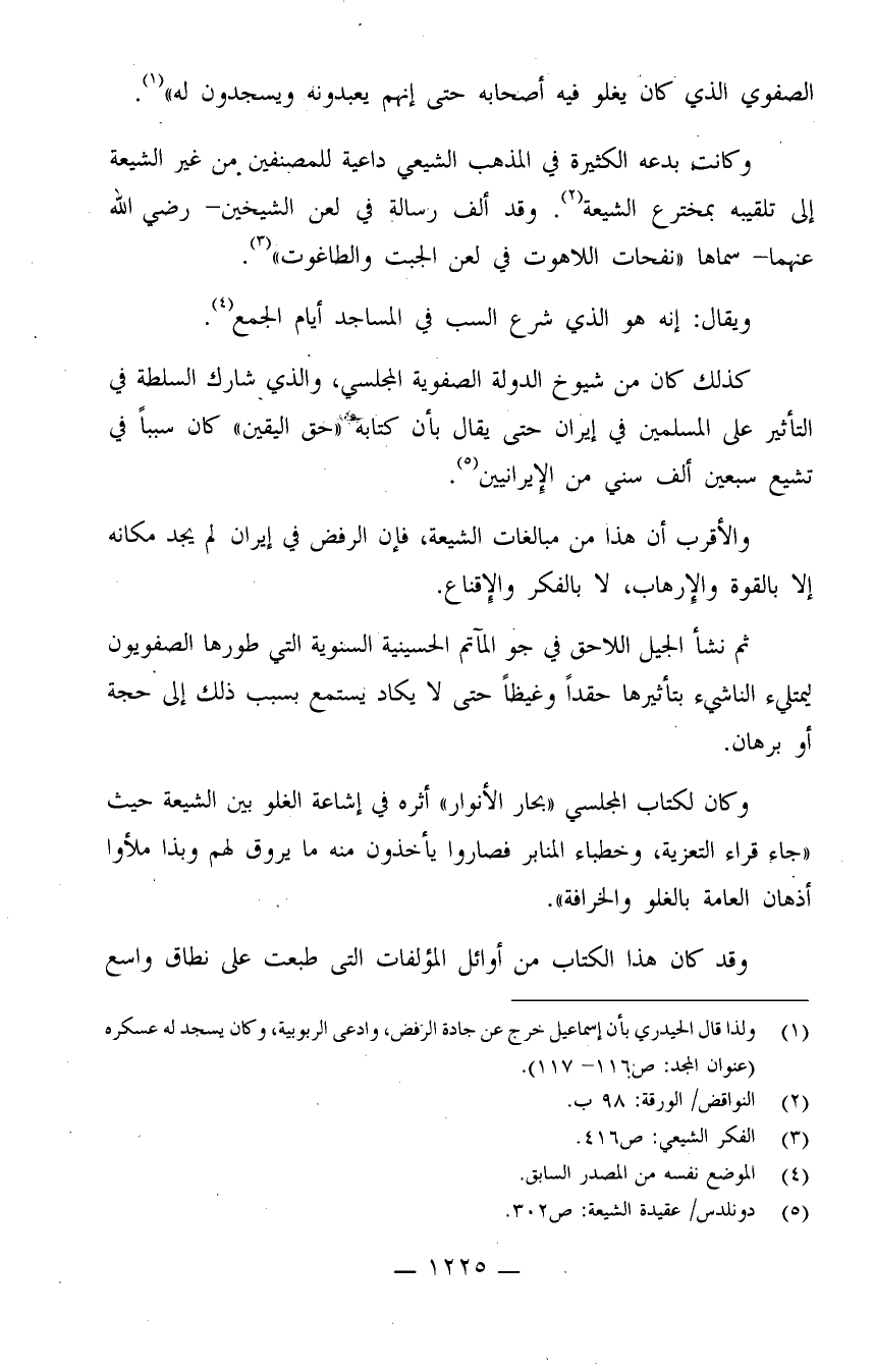 كذلك كان من شيوخ الدولة الصفوية المجلسي، والذي شارك السلطة في التأثير على المسلمين في إيران حتى يقال بأن كتابه "حق اليقين" كان سبباً في تشيع سبعين ألف سني من الإيرانيين" (¬5) .