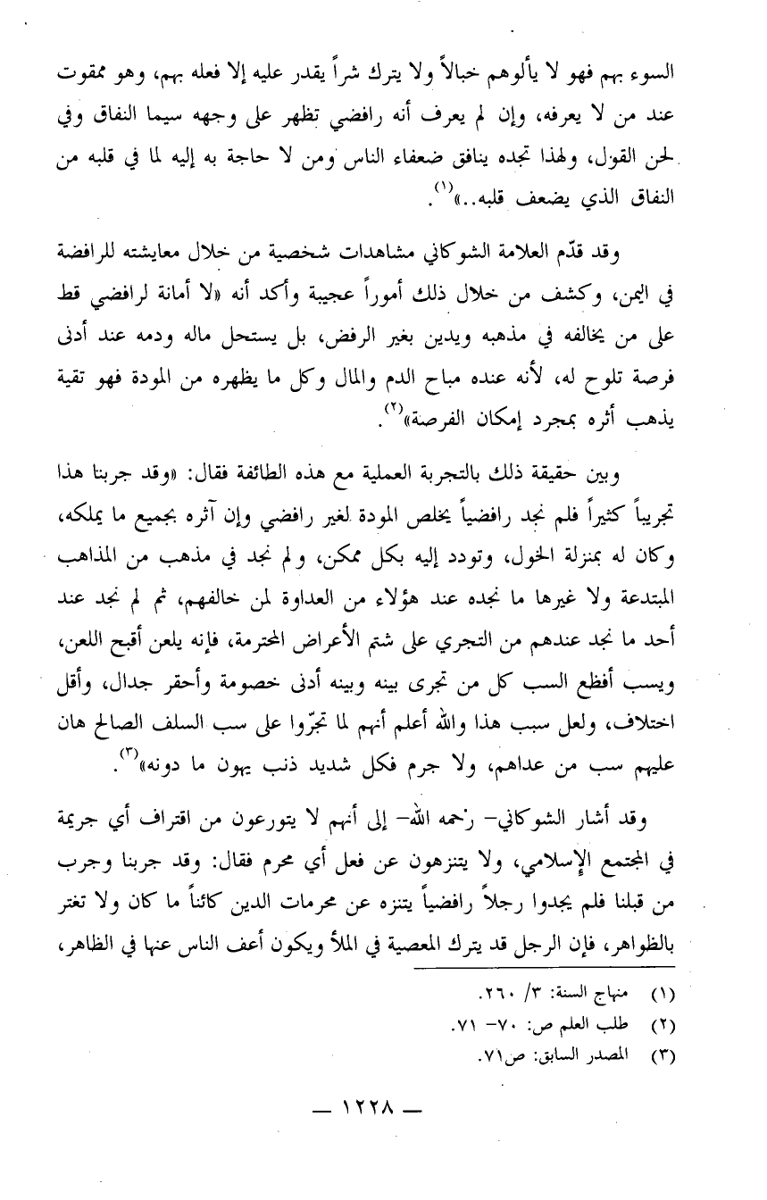 وقد قدّم العلامة الشوكاني مشاهدات شخصية من خلال معايشته للرافضة في اليمن، وكشف من خلال ذلك أموراً عجيبة وأكد أنه "لا أمانة لرافضي قط على من يخالفه في مذهبه ويدين بغير الرفض، بل يستحل ماله ودمه عند أدنى فرصة تلوح له، لأنه عنده مباح الدم والمال، وكل ما يظهره من المودة فهو تقية يذهب أثره بمجرد إمكان الفرصة" (¬2) .
