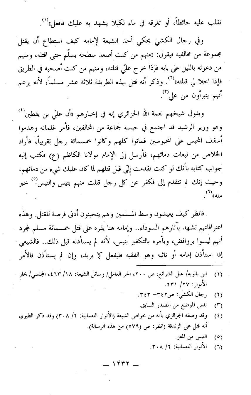 ويقول شيخهم نعمة الله الجزائري أنه في إخبارهم "أن عليّ بن يقطين (¬4) . وهو وزير الرشيد قد اجتمع في حبسه جماعة من المخالفين، فأمر غلمانه وهدموا أسقف المحبس على المحبوسين فماتوا كلهم وكانوا خمسمائة رجل تقريباً، فأراد الخلاص من تبعات دمائهم، فأرسل إلى الإمام مولانا الكاظم (ع) فكتب إليه جواب كتابه بأنك لو كنت تقدمت إليّ قبل قتلهم لما كان عليك شيء من دمائهم. وحيث إنك لم تتقدم إليّ فكفر عن كل رجل قتلت منهم بتيس، والتيس (¬5) . خير منه" (¬6) .