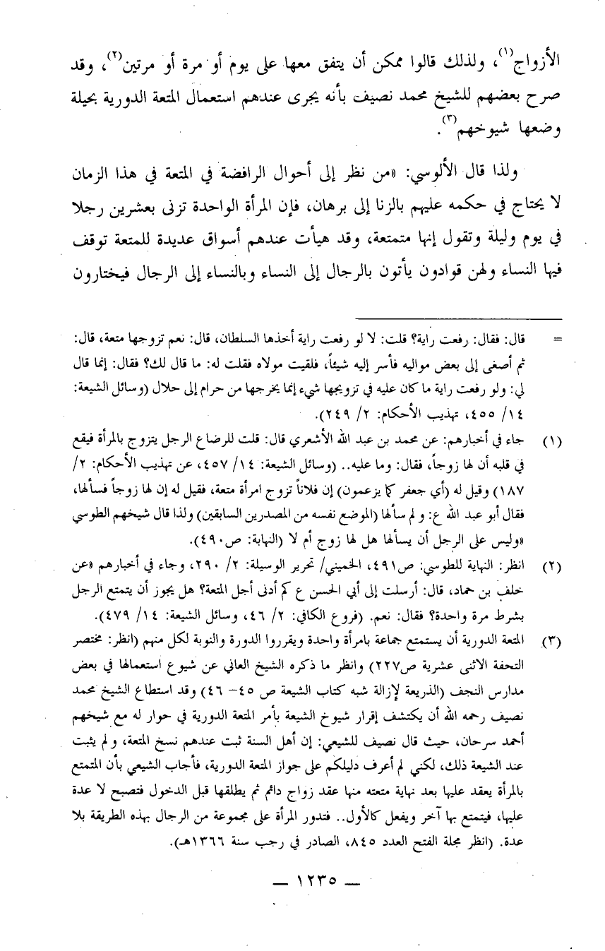 (¬2) انظر: النهاية للطوسي: ص491، الخميني/ تحرير الوسيلة: 2/290، وجاء في أخبارهم عن خلف بن حماد، قال: أرسلت إلى أبي الحسن (ع) كم أدنى أجل المتعة؟ هل يجوز أن يتمتع الرجل بشرط مرة واحدة؟ فقال: نعم. (فروع الكافي: 2/46، وسائل الشيعة: 14/479)