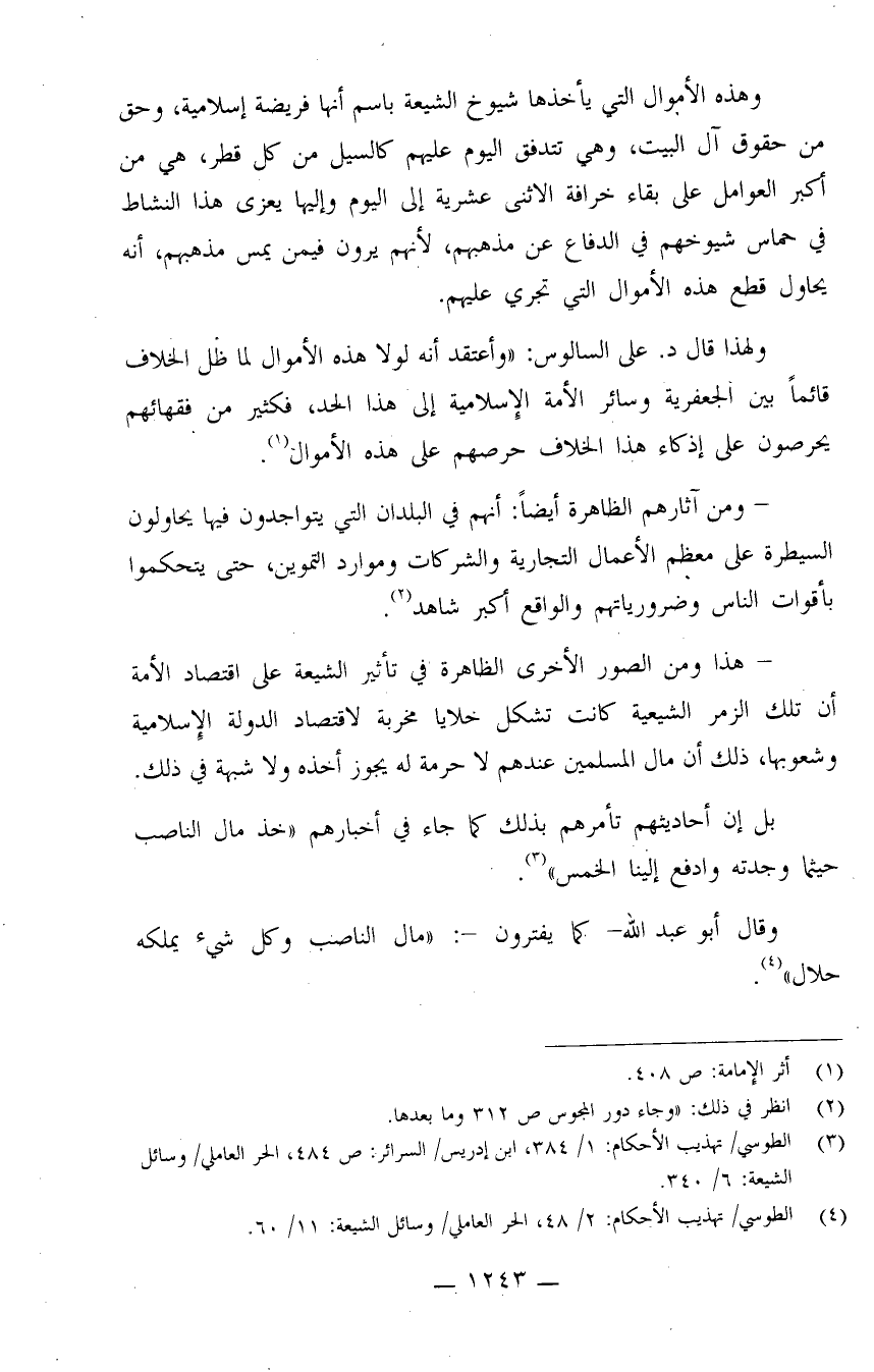 وهذه الأموال التي يأخذها شيوخ الشيعة باسم فريضة إسلامية وحق من حقوق آل البيت، وهي تتدفق اليوم عليهم كالسيل من كل قطر، هي من أكبر العوامل على بقاء خرافة الاثني عشرية إلى اليوم، وإليها يعزى هذا النشاط في حماس شيوخهم في الدفاع عن مذهبهم، لأنهم يرون فيمن يمس مذهبهم، أنه يحاول قطع هذه الأموال التي تجري عليهم.
