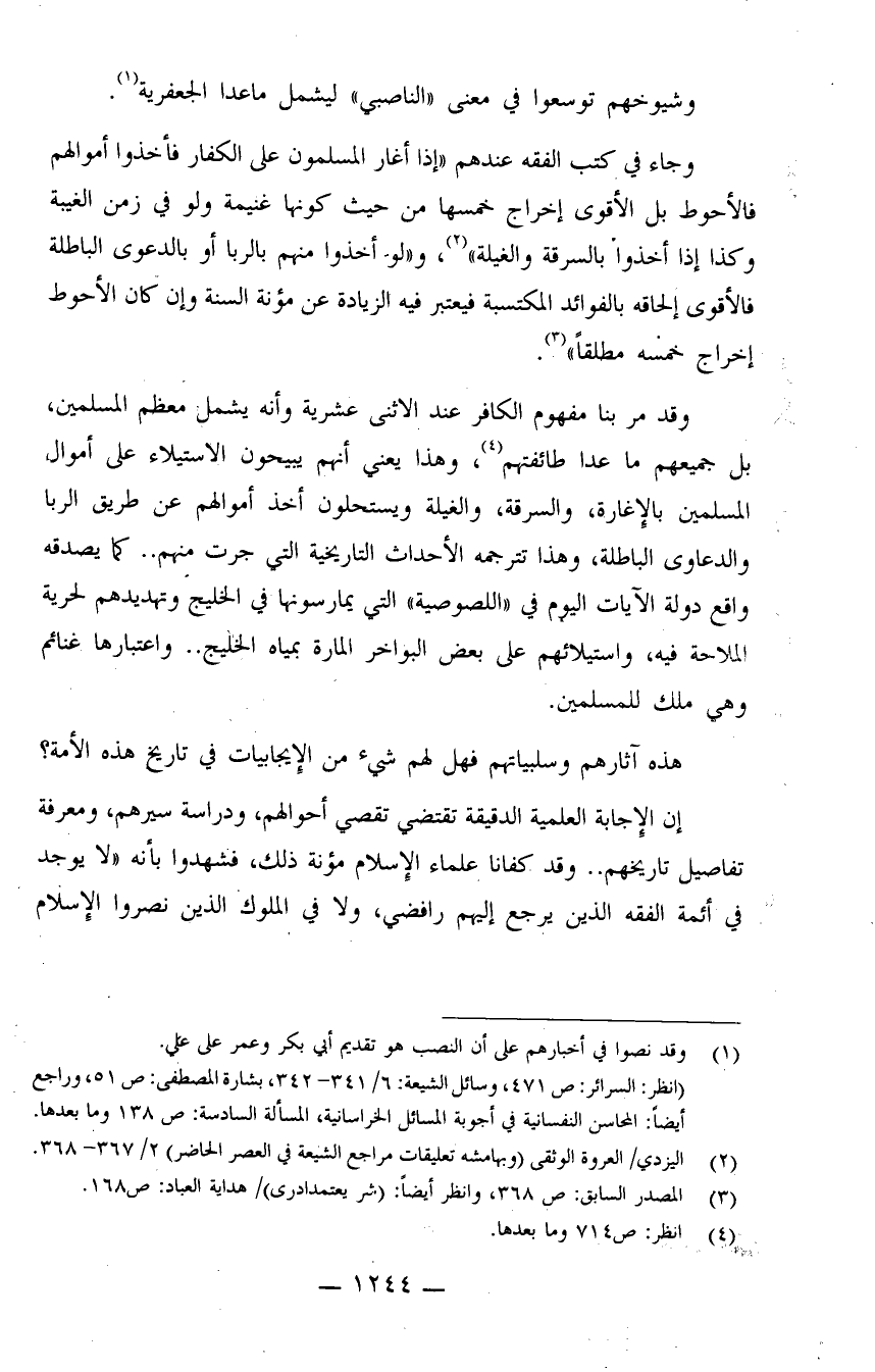 وقد مر بنا مفهوم الكافر عند الاثني عشرية وأنه يشمل معظم المسلمين، بل جميعهم ما عدا طائفتهم (¬4) ، وهذا يعني أنهم يبيحون الاستيلاء على أموال المسلمين بالإغارة، والسرقة، والغيلة، ويستحلون أخذ أموالهم عن طريق الربا والدعاوى الباطلة، وهذا تترجمه الأحداث التاريخية التي جرت منهم.. كما يصدقه واقع دولة الآيات اليوم في "اللصوصية" التي يمارسونها في الخليج وتهديدهم لحرية الملاحة فيه، واستيلائهم على بعض البواخر المارة بمياه الخليج.. واعتبارها غنائم وهي ملك للمسلمين.