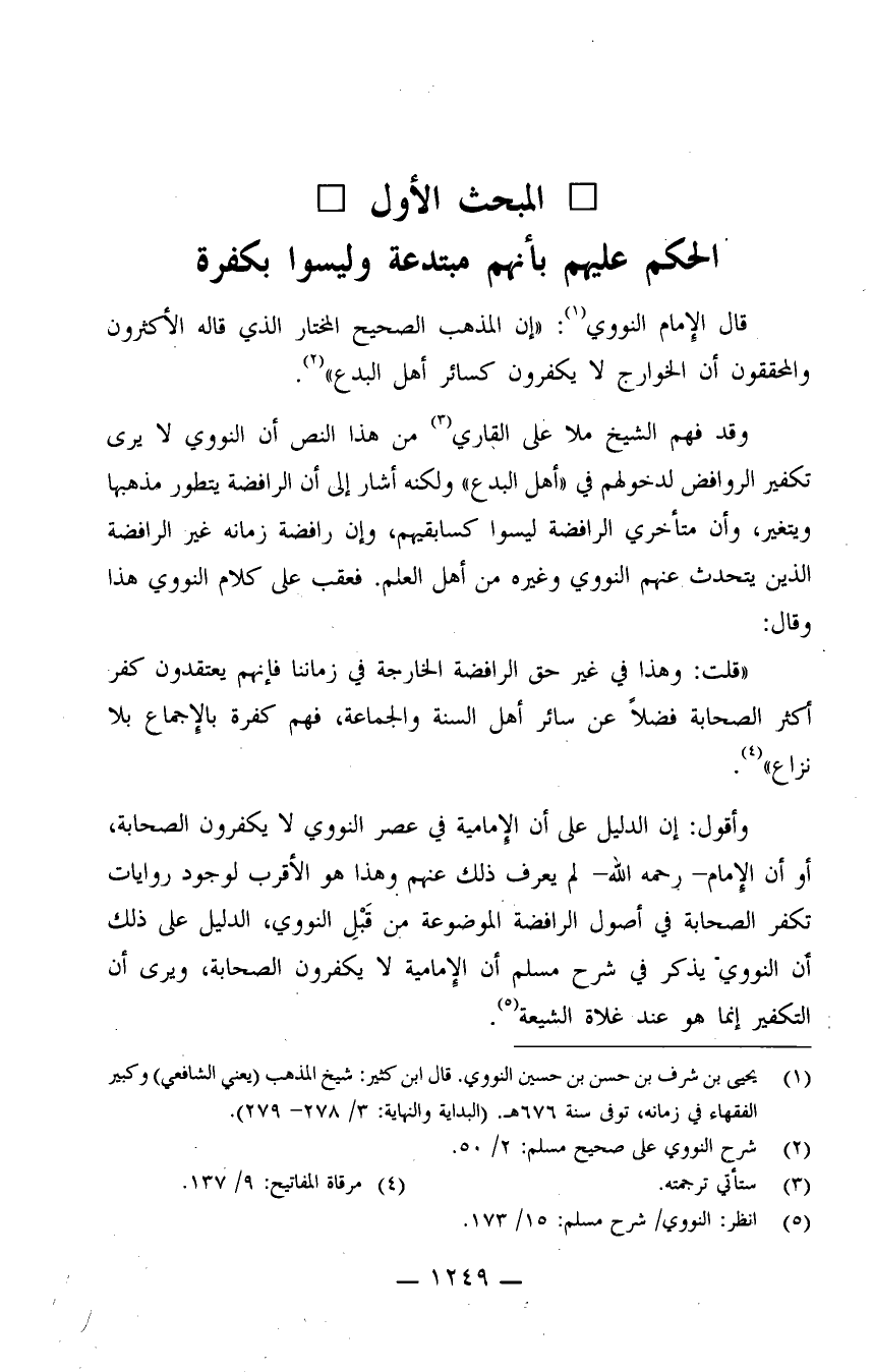 وأقول: إن الدليل على أن الإمامية في عصر النووي لا يكفرون الصحابة، أو أن الإمام - رحمه الله - لم يعرف ذلك عنهم وهذا الأقرب لوجود روايات تكفر الصحابة في أصول الرافضة الموضوعة من قِبَل النووي، الدليل على ذلك أن النووي يذكر في شرح مسلم أن الإمامية لا يكفرون الصحابة، ويرى أن التكفير إنما هو عند غلاة الشيعة (¬5) .