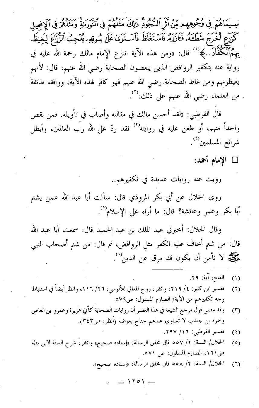 سِيمَاهُمْ فِي وُجُوهِهِم مِّنْ أَثَرِ السُّجُودِ ذَلِكَ مَثَلُهُمْ فِي التَّوْرَاةِ وَمَثَلُهُمْ فِي الإِنجِيلِ كَزَرْعٍ أَخْرَجَ شَطْأَهُ فَآزَرَهُ فَاسْتَغْلَظَ فَاسْتَوَى عَلَى سُوقِهِ يُعْجِبُ الزُّرَّاعَ لِيَغِيظَ بِهِمُ الْكُفَّارَ..} (¬1) قال: "ومن هذه الآية انتزع الإمام مالك رحمة الله عليه وفي رواية عنه بتكفير الروافض الذي يبغضون الصحابة رضي الله عنهم، قال: لأنهم يغيظونهم ومن غاظ الصحابة رضي الله عنهم فهو كافر لهذه الآية، ووافقه طائفة من العلماء رضي الله عنهم على ذلك" (¬2) .
