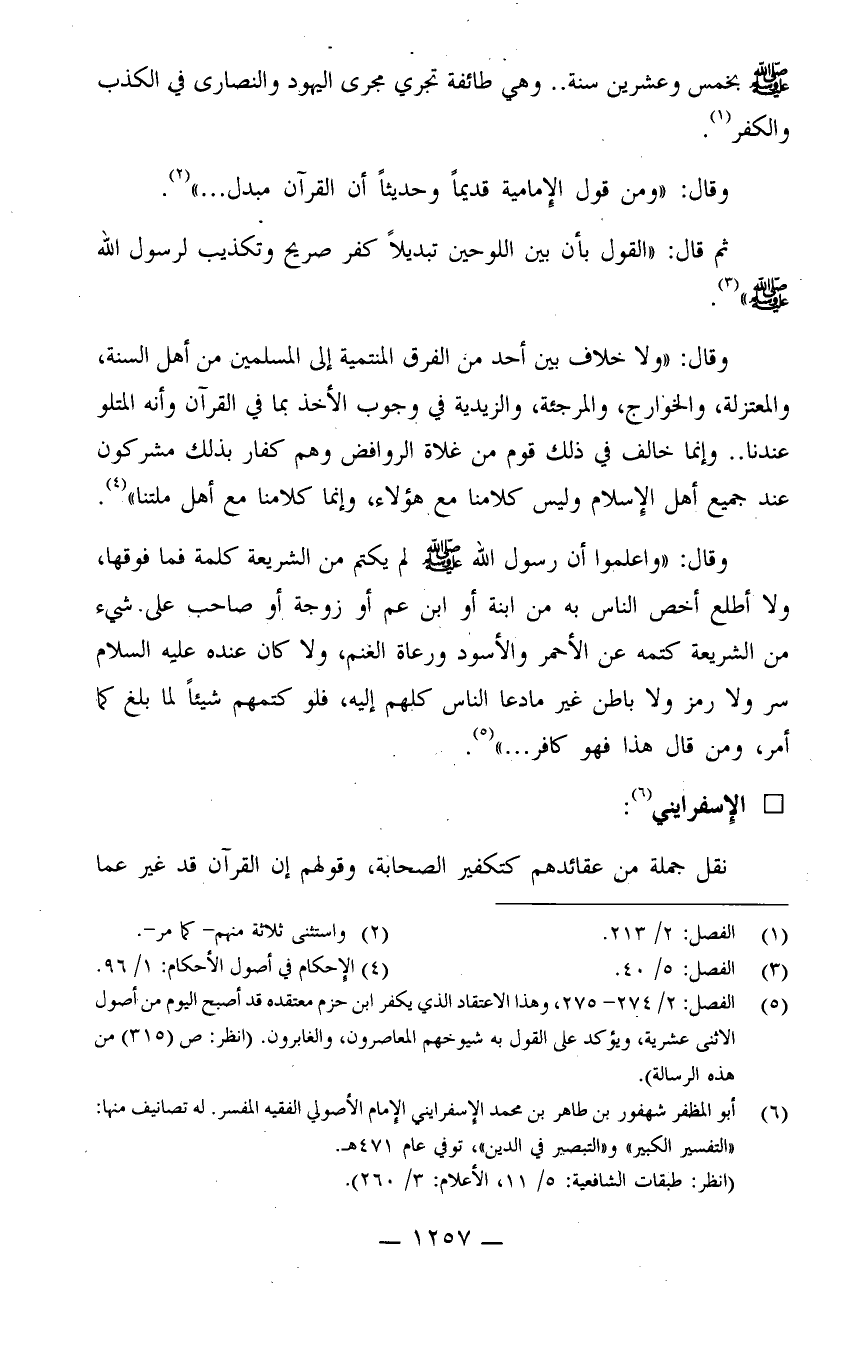 (¬5) الفصل: 2/274-275، وهذا الاعتقاد الذي يكفر ابن حزم معتقده قد أصبح اليوم من أصول الاثني عشرية، ويؤكد على القول به شيوخهم المعاصرون، والغابرون.
