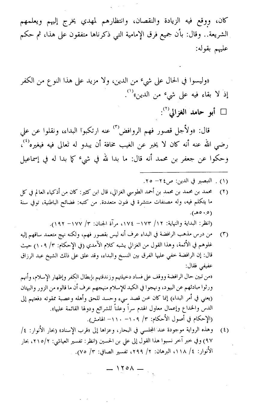 (¬3) من درس مذهب الرافضة في البداء عرف أنه ليس بقصور فهم، ولكنه نهج متعمد ساقهم إليه غلوهم في الأئمة، وهذا القول من الغزالي يشبه كلام الآمدي (في الإحكام: 3/109) حيث قال: إن الرافضة خفي عليها الفرق بين النسخ والبداء، وقد علق على ذلك الشيخ عبد الرزاق عفيفي فقال: